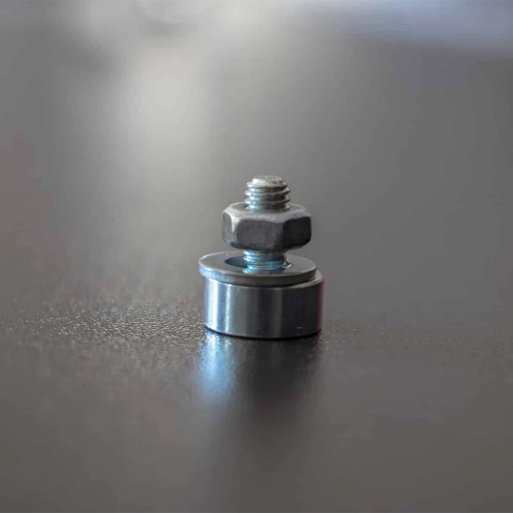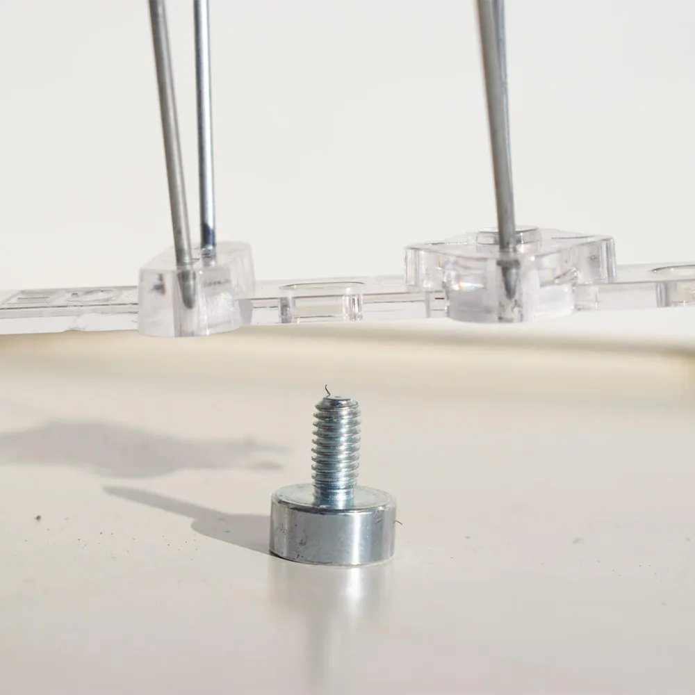 Následně na čep položíte podložku a došroubujete matici.Magnety stačí rozložit na podstavě 3x - na obou koncích a ve středu podstavy.